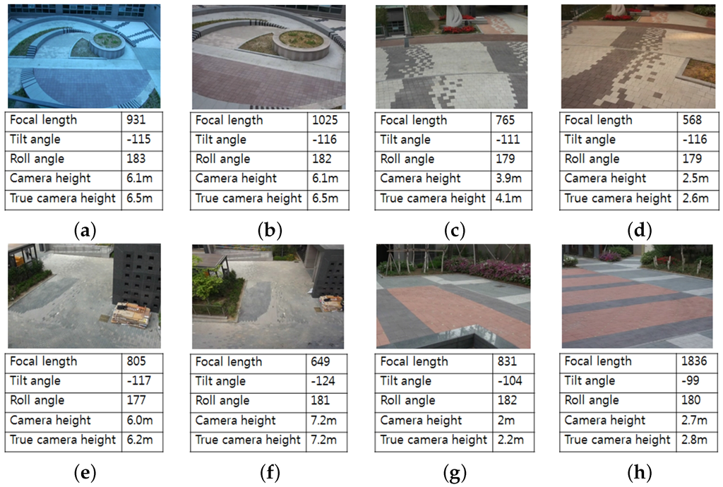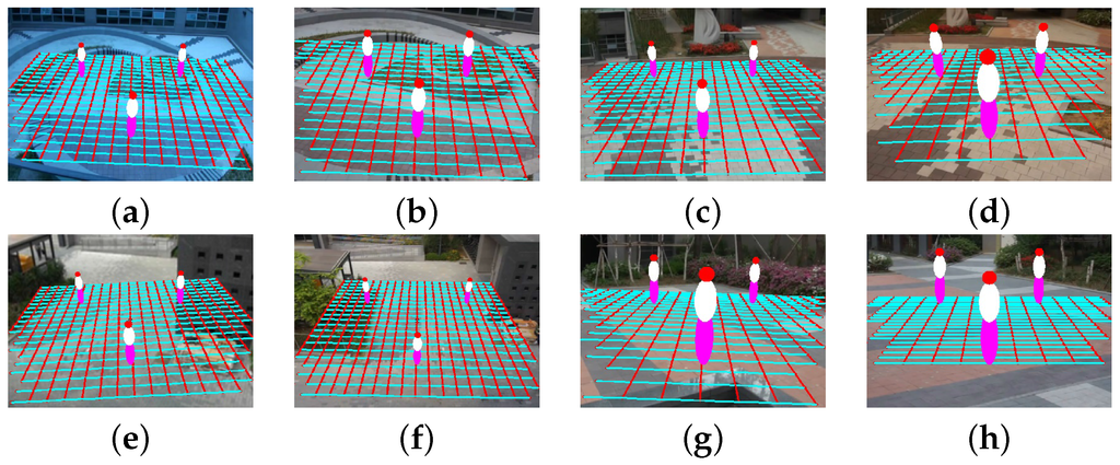Figure 15 shows eight test videos with estimated camera parameters. Figure 16 shows the camera calibration results of eight test videos on the virtual ground plane and ellipsoids of a height of 180 cm.