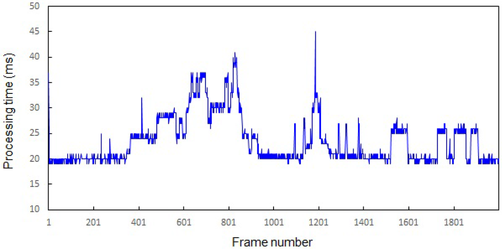Figure 22 shows the processing time of the proposed algorithm. To measure the processing time, a personal computer is used with a 3.6-GHz quad-core CPU and 8 GBytes of memory. As shown in Figure 22, it takes 20–45 ms to process a frame, and the average processing speed is 39 frames per second (FPS).
