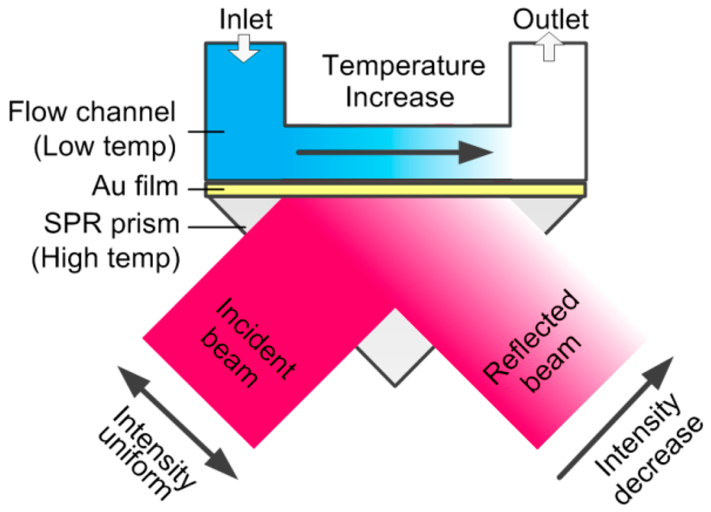 Surface plasmon resonance (SPR) is a collective charge density oscillation that occurs at a metal-dielectric interface. As SPR is extremely sensitive to the temperature-dependent refractive index (RI) just above the metal film, it has extensive applications in temperature monitoring and sensing [20,21,22]. In work performed by Chiang et al., a variation as small as 0.027 K was distinguished at 632.8 nm [23]. Furthermore by means of SPR imaging, the refractive index distribution on the whole sensing surface can be simultaneously monitored. When liquid flows through the sensing unit, the temperature above the sensing surface is redistributed. Because the refractive index (RI) is inversely proportional to the temperature, the RI varies along the flow channel, leading to a corresponding variation of the SPR response. Therefore, the liquid flow rate can be resolved from the SPR response variations.