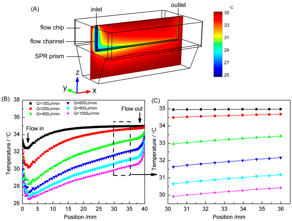 (A) Heat map of the SPR sensing chip. (B,C) the water temperature variations in the flow channel at different flow rates.