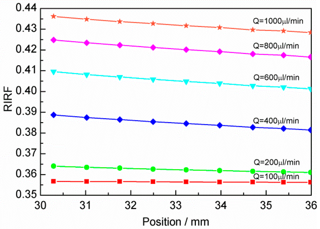 The RIRF distributions and processed results of other flow rates are presented in Figure 9. It shows that higher flow rates result in larger RIRF and larger RIRF variation rate. Lower flow rates prolong the heating time of the water flow, resulting in a higher temperature at the monitoring area. As the RIRF is negatively proportional to temperature, RIRF increased with the flow rate. In addition, it is possible that the temperature of slower water flow has reached approximately the equilibrium temperature, while the water of higher flow was still heated and thus generated high RIRF variation rate in the SPR monitoring area. This was consistent with the previous COMSOL simulations.