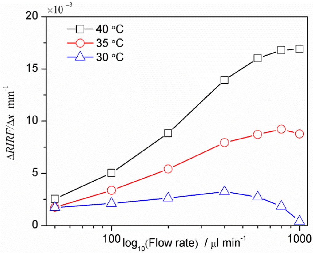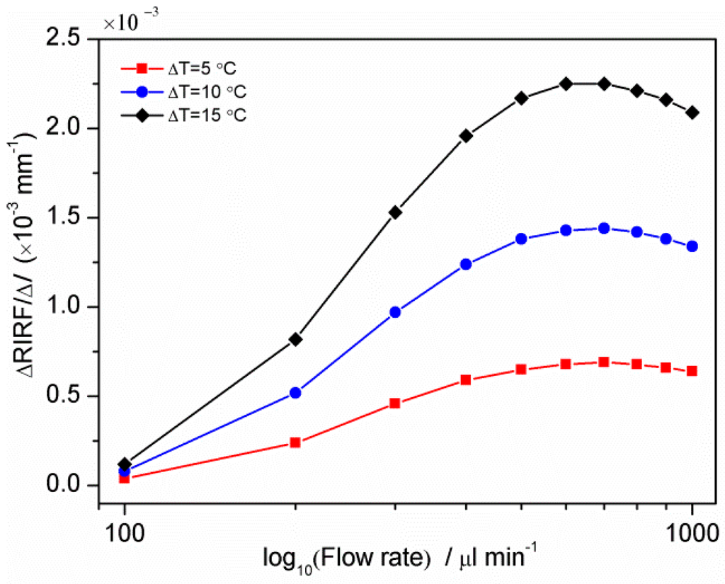 The temperature difference between the liquid and prism is a key factor affecting the prism-liquid heat exchange, leading to different temperature variation rates. To research the effect of the liquid-prism temperature on the measurement, the water temperature was fixed at 25 °C while the prism temperature was changed to 30, 35 and 40 °C, respectively. The relationship between the ΔRIRF/Δl and the logarithm of flow rate is shown in Figure 4. It can be seen that the detection range is about 100–500 μL/min, with the linear range also being approximately 100–500 μL/min. When the fluid is faster than 500 μL/min, the temperature variations in the monitoring section of the flow channel are hardly distinguishable. Therefore the upper limit of the linear range is 500 μL/min. The lower limit of 100 μL/min was chosen due to the performance of the pumping system, and not due to limitations of the sensor. With larger liquid-prism temperature differences, the sensitivity of the measurement was enhanced.