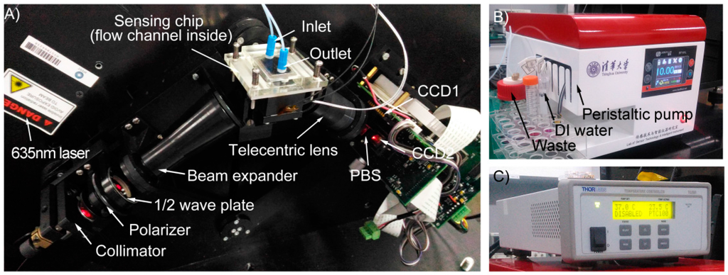 A Poly (dimethylsiloxane) (PDMS) sheet with a channel of 0.5 × 1 mm2 cross-section was pressed and sealed with the sensing chip, forming the flow channel. The sensing chip was positioned into an aluminum holder, in which a PT100 resistance thermometer detector (RTD) and a polyimide heating film were embedded. A PID temperature controller (TC200, Thorlabs, Shanghai, China) was used to control the sensing chip temperature.