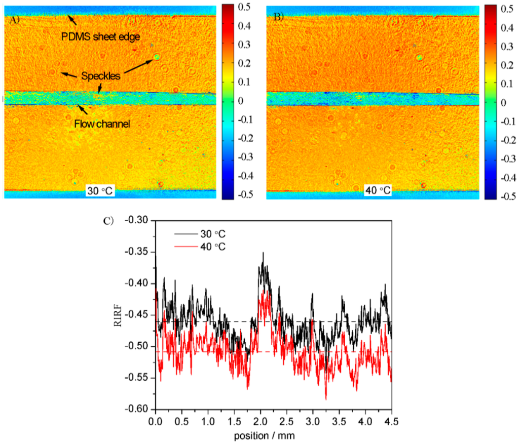 It is necessary to test the SPR response distribution across the sensing surface before measuring its variations. Figure 6 shows the RIRF distribution across the sensing surface when the water was 30 and 40 °C, respectively. It is obvious that the SPR response was uniform except for some speckles in the flow channel. To quantify the SPR response variation along the flow channel, the response was averaged widthwise and the average response along the flow stream was shown in Figure 6C. It can be seen that the SPR response was relatively unchanged except for the disturbance of some speckles. This verified that SPR imaging was able to measure the flow-induced SPR response variations.