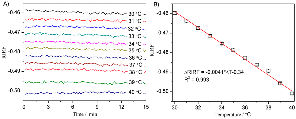 The RIRF variations versus time at different temperatures (A) and the relationship between RIRF and temperature (B).