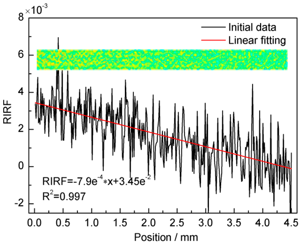 Figure 8 shows the RIRF distribution (inset) of a 50 μL/min water flow rate and the subsequent signal processing. It can be seen from the inset that the RIRF decreased slightly along the flow stream. This occurred because the water flow was heated by the prism and thus the temperature increased gradually at it moved downstream. Due to the negative linear relationship between the temperature and RIRF, the RIRF decreased along the streams. The widthwise-averaged RIRF variations along the flow streams were fitted linearly with a decreasing rate of nearly −7.9 × 10−4 RIRF/mm.