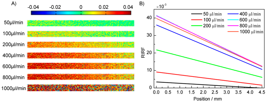 A time series of RIRF distribution images of the sensing surface was sequentially extracted from the two interferograms. The temperature distributions in the flow channel were included in the RIRF images. To quantify the SPR response variation along the flow streams, the RIRF was averaged widthwise and then the average RIRF along the flow channel was plotted using a linear fit with the distance from the inlet. The RIRF variation rate was used to quantify the flow rates.