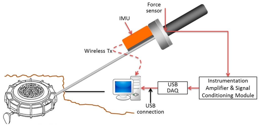 The electronic module for signals conditioning is responsible of filtering and amplifying the force sensor output in order to meet the requirements of the next stage, in which the DAQ module converts the resulting analogic signal into a digital one for further processing. The USB DAQ module is connected to a PC where the HMI is installed, so that the HMI can be able to process, record and display the trainee data. The sampling frequency was chosen to be 100 Hz for the IMU signals and 500 Hz for the force signal. Figure 2 shows a block diagram of the intelligent feedback prodder with the IMU and the force sensor, the electronic module for signals conditioning and the DAQ module. Figure 3 displays a real photo with the main components of the proposed tool.