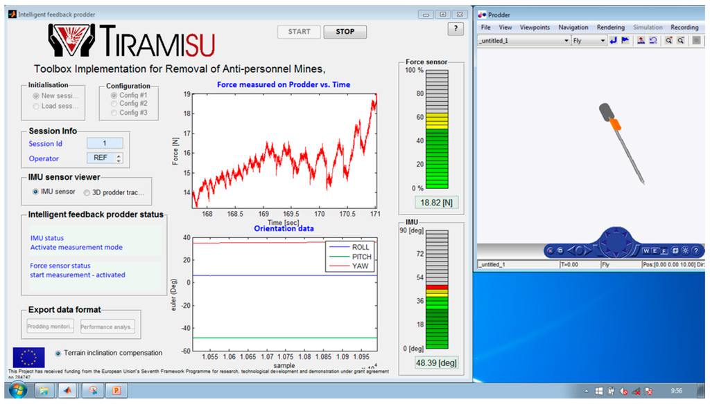 The design of innovative prodders may contribute to increase the rate of mines detected but does not definitively increase the safety of the deminers. Training is then one of the most crucial aspects in order to improve the safety and effectiveness of the landmine detection activities performed by human operators [17]. However, in the literature there is not any study that has been devoted to the improvement of training tools utilized during prodding activities. Prodding has the disadvantage that unlike other aspects of training, the use of excessive force cannot be detected simply by a supervisor observing the trainee. Some studies [18] involving field measurements of the force exerted by the operators showed that deminers, and even senior training staff, had no real idea of the force they were using and consistently underestimated the force they were exerting by large amounts. Therefore, to alleviate this situation, this paper presents an intelligent prodder that provides useful information to the deminers in two critical issues: (a) the amount of force exerted on the target and if it is greater than the safe limit and, (b) to alert them when the angle of insertion of the prodder is approaching or exceeding a certain dangerous limit. In this way, the tool will contribute to improve the deminers’ competencies and consequently, will help to reduce the number of demining accidents during close-in detection tasks. The work presented here has been carried out within the framework of the TIRAMISU project, funded by the European commission in the 7th Framework Programme.