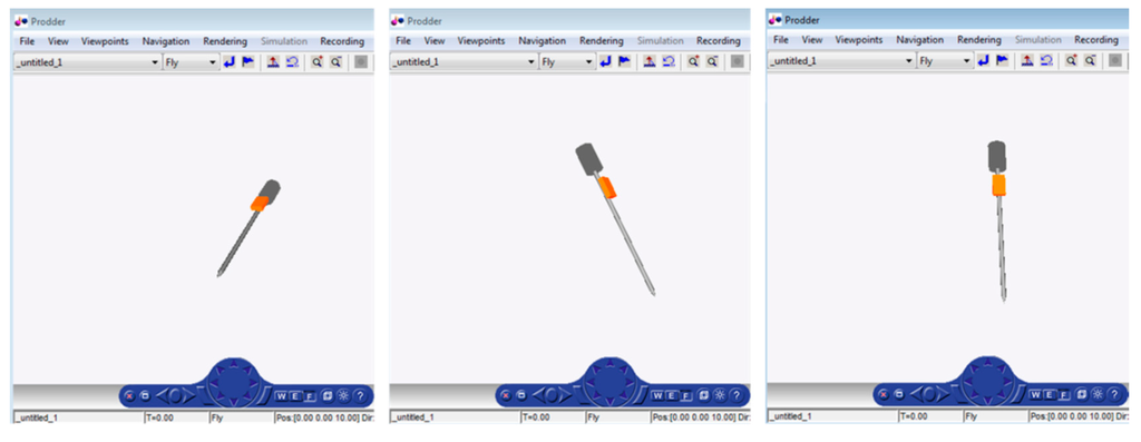 This VRML graphic reconstructs in real time the orientation of the prodder carried out by the human operator. The graphic enables the instructor to check if each prodding is being performed with a proper angle of insertion. Figure 5 shows different snapshots from the prodder monitoring.