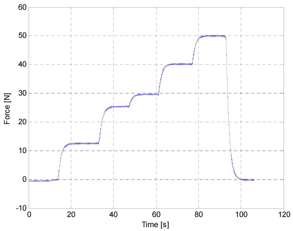 The first part of the experimentation was devoted to the assessment of the force feedback provided by the intelligent prodder. Figure 8 displays several force measurements obtained with the instrumented prodder. In this test, the prodder was located vertically and was gradually loaded with masses of 1.25 kg, 2.5 kg, 3 kg, 4 kg and 5 kg. The mean values measured by the sensory system were 12.5 N, 25 N, 30 N, 40 N and 50 N, approximately. Figure 9 shows the absolute and the relative errors for the obtained force measurements. Thus, results provided by the intelligent feedback prodder demonstrate that the force sensor has an accurate dynamic response.