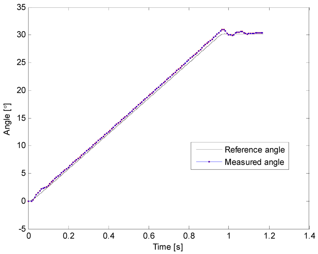Figure 11 and Figure 12 illustrate results of two of the experimental tests that were carried out. Black lines represent the reference angle trajectory programmed for the first degree of freedom of the robotic arm, which corresponds to the movement of the shoulder, whereas the red squares plotted on the red lines represent the measurements acquired with the sensory system of the proposed prodder. On these examples, the robot was programmed to move its shoulder 30° from the horizontal position, and once this position is achieved, come back to the original configuration. Note also that on Figure 11, sampling rate was set to 120 Hz for the measurement of the prodder’s angle, while in Figure 12 the sample rate was decreased to 20 Hz. In both cases, the angle tracking provided by the intelligent feedback prodder exhibits a high accuracy.