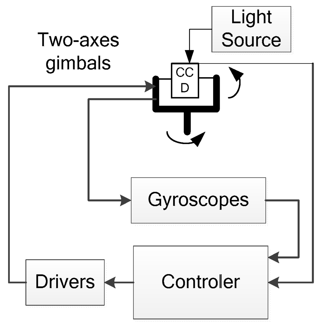 The configuration of the CCD-based tracking system is a two-axes gimbals design illustrated in Figure 1. The sensors include FOG and a CCD. The FOG gyroscope mounted on the gimbal is usually used as the feedback component of the velocity closed loop. The controller is used to implement the control algorithm. The driver actuates the motors to achieve the tracking control. The light source is used to simulate the target of the CCD.