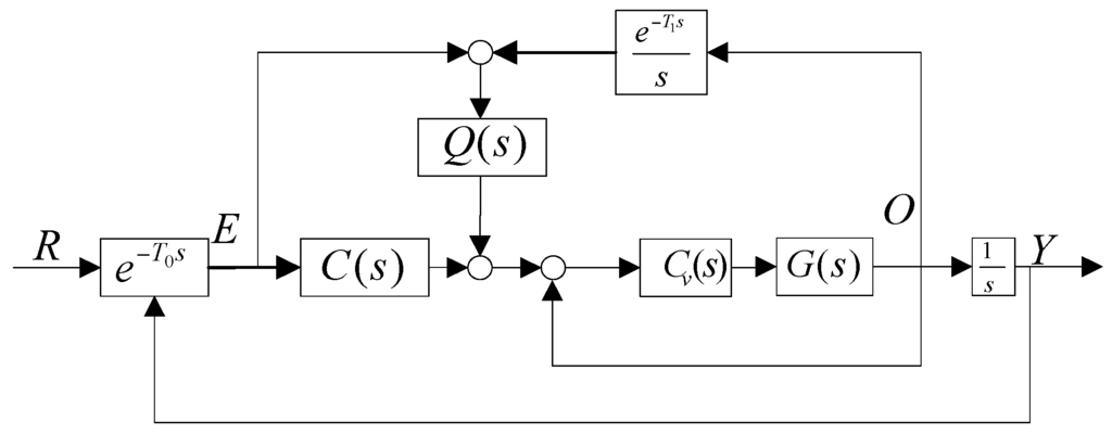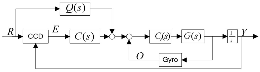 The control mode of Figure 1, which includes two closed loops (position loop and velocity loop) and feed forward loop is shown in Figure 2. Q(s) is the feedforward controller. G(s) is the control plant. C(s), Cv(s) are the position controller and the velocity controller. The time delay characterizes the CCD in the control system although it may be rough. R represents the target trajectory. E is the line of sight error. O is the output of the fiber-optic gyroscope (FOG), which provides the gimbal rate. A FOG providing the angular velocity of the gimbal usually has high bandwidth, resulting in a little effect towards to the closed-loop bandwidth. Therefore, the characteristic of the gyro can be considered to constant one in this control system.