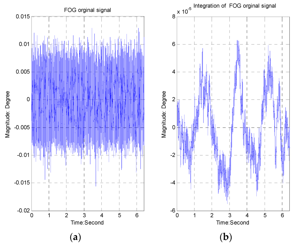 The bandwidth of the FOG is above 500 Hz. The characteristics of the FOG noise are depicted in Figure 4 (Figure 4a represents the original signal, while Figure 4b describes the integration signal). The peak value of the FOG noise is equal to 0.025°/s, and the RMS value is about 0.0037°/s.