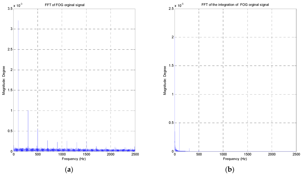 Besides some “spikes”, the amplitude value of amplitude-frequency curve is smooth in Figure 5 (Figure 5a represents the FFT of the original signal, while Figure 5b describes the FFT of the integration signal). Especially, the integration of FOG signal is smoother due to the integral impact.