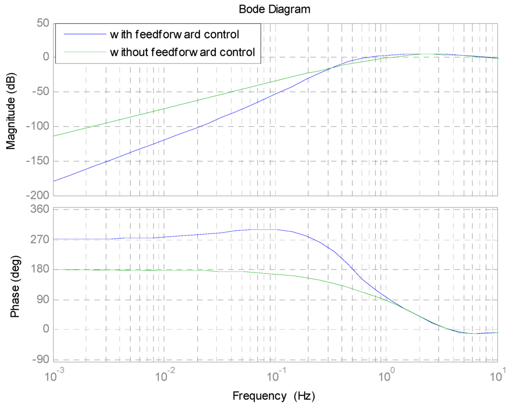 Based on the aforementioned considerations and design, the responses of the sensitivity Equations (12) and (13) are shown in Figure 6. A large attenuation, about one tenth less than that with only feedback loop control, is achieved in the low-frequency region with the feedforward controller in Figure 6. However, the attenuation in the middle-frequency range is magnified from 0.3 Hz to about 1.4 Hz, a little bigger than that achieved with the only feedback control. This is due to the amplification provided by the Kalman filter.