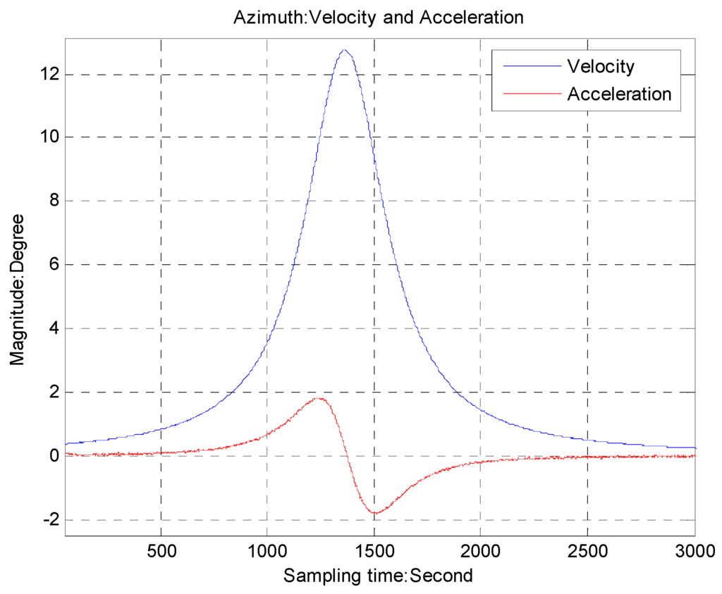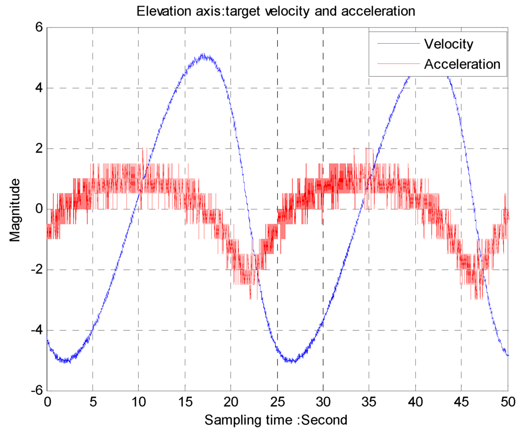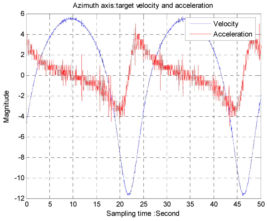 The trajectory of a moving target is provided by dynamic moving target simulators. A two-axis gimbal system with a 50 Hz CCD as a tracker is used to track the moving target. The angular speed from the gyro is shown in Figure 9 while acceleration is differentiated by the gyro as shown in Figure 10. The period of the trajectory is about 22 s, equivalent to 0.048 Hz.