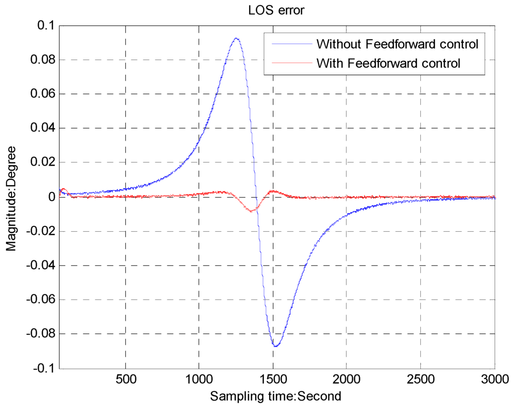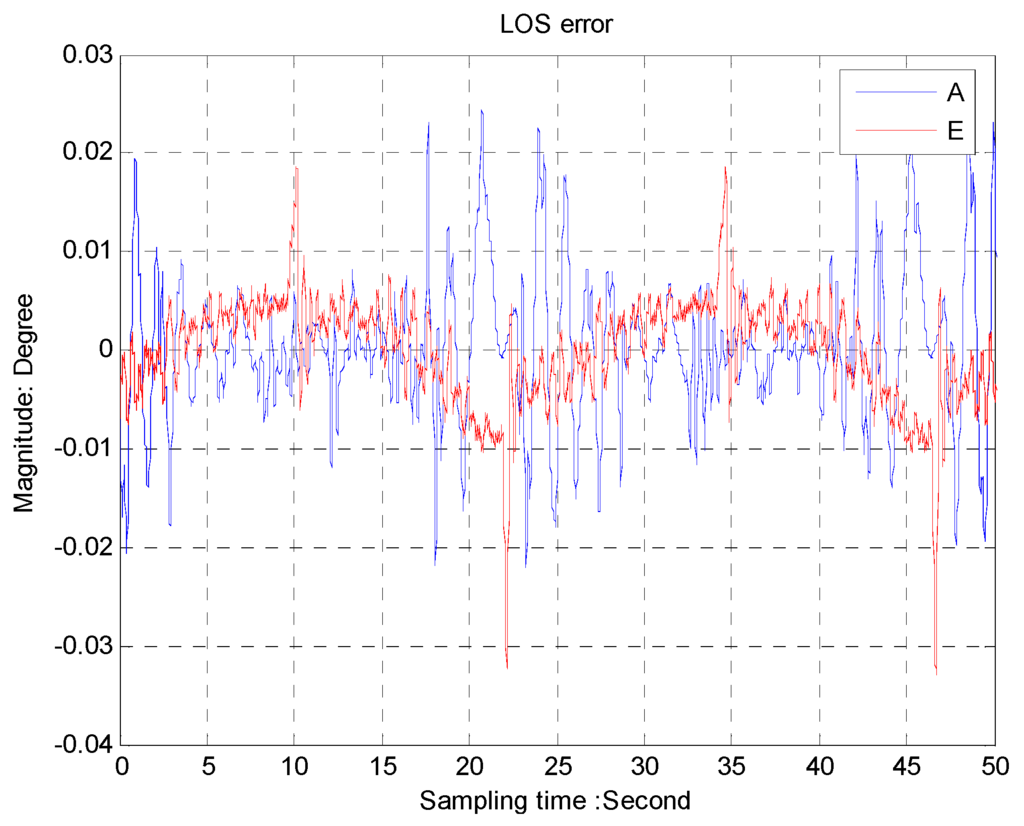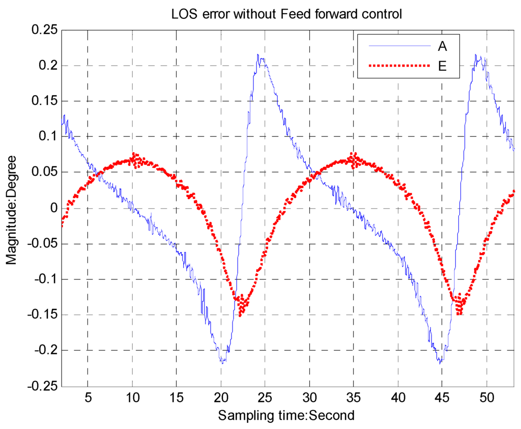 The LOS errors with the feed forward control, shown in Figure 11, are about 0.02° for the azimuth axis and 0.01° for the elevation axis, while we can see in Figure 12 that the LOS errors are about 0.2° for the azimuth axis and 0.12° for the elevation axis, respectively, without the feed forward control.
