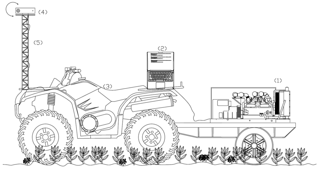 Schematic design of the system with the components integrated for maize-weed detection. (1) Portable gasoline generator; (2) laptop; (3) ATV; (4) Kinect v2 sensor; (5) support structure.