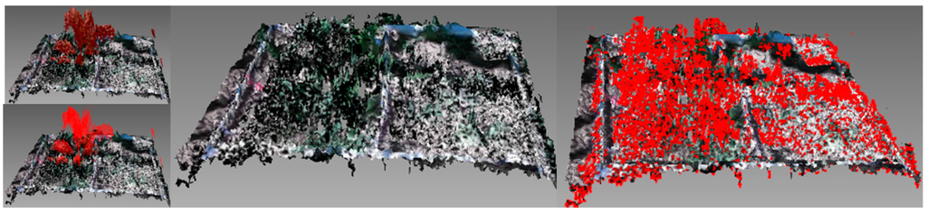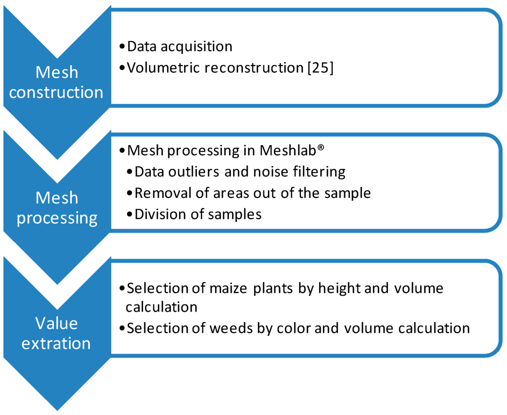 The meshes were processed to calculate maize and weed volume (Figure 2b). The offline processing of the samples was conducted using the open software Meshlab® (3D-CoForm, Brighton, UK). The initial point cloud was processed in three steps [,] (Figure 3): (a) Data outliers and noise in the point cloud were filtered out. The filter identifies the points with no connection (1 cm out of the grid) and removes them. (b) The areas out of the 1 m × 1 m frame were removed and the mesh was divided into samples of 0.5 m × 0.5 m. The division and removal of areas out of the frame were automatically done based on the color segmentation of the white frame. (c) Plant volumes were calculated from the mesh by computation of polyhedral mass properties []. Firstly, the maize parts of the mesh were isolated by height (Figure 4). Because the maize plants were considerably taller than the weeds, the upper part and the connected faces of the mesh were selected. From this selection, a new mesh was created, and maize volume was extracted. Then, after the selection and removal of the maize plants in the mesh, an RGB filter was applied to select the reaming green parts corresponding to weeds. The mesh volume of weeds was then obtained. The calculated volumes extracted from the meshes were statistically compared with the actual weight values, which were manually assessed.