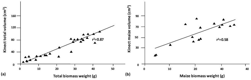 Linear regression between both the total volume that was estimated using the Kinect v2 sensor and the total biomass (a) and the maize volume with the maize biomass (b). The R2 denotes the correlation coefficient of the simple regression.