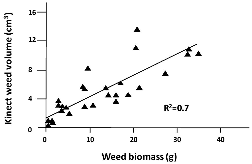 In addition, the discrimination of the color of the weeds opens a new window for weed control. The Kinect v1 sensor had a lower resolution and an inability to work in outdoor conditions due to lighting conditions, which were the main deterrents to its usage. The improvements in the Kinect v2 sensor allowed for the acquisition of meshes outdoors with real and uncontrolled lighting. The separation of weed areas from the mesh and the calculated volume resulted in a linear correlation between the volumes estimated from the models and the actual parameters of weed biomass. The regression showed an r2 of 0.7, indicating a good relationship with the volume data obtained with the Kinect device. Figure 6 shows the simple regression for weed biomass and weed volume, with a good relation between values, which demonstrate the suitability of the sensor for weed detection. Although RGB recognition is a good complement for weed isolation in 3D models, using color-image processing by itself for volume calculation results in worse predictions than depth images [].