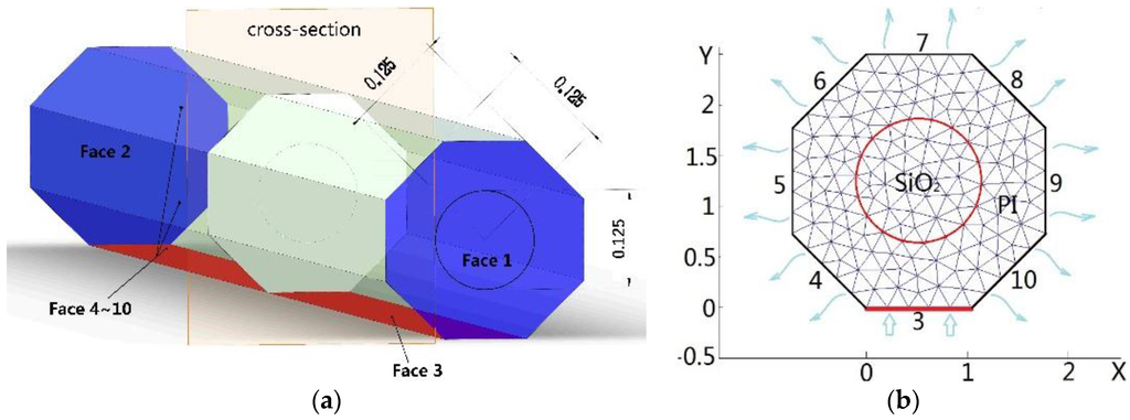 When a FBG is fixed on a hot surface, it is in contact with the surface in a narrow line and the remainder of cylindrical surface contacts with air. Heat energy transfers from the hot surface to the optical fiber and dissipates into the surrounding air by heat convection. In order to simplify the model, we suppose the optical fiber is a thin and long wire with an octagonal cross-section. The diameter of its inscribed circle is equal to the diameter D of the optical fiber 250 micrometer (including core, cladding, and coating). The installation length of the optical fiber is 20 mm. The heat transfer model of the FBG mounted on the surface is shown in Figure 2a. The bottom face, Face 3, is in contact with the heat source and its temperature kept constant at T0. The two end faces (Faces 1 and 2) of the optical fiber is so small that we consider them as heat insulation with the surroundings. The remaining side faces (Faces 4–10) are in contact with the air. The convection heat-transfer coefficient is h and the surrounding temperature is . According to symmetry, each cross-section of the optical fiber has a uniform temperature distribution along the axis of the fiber. The three-dimensional temperature field can be simplified into a two-dimensional temperature field as shown in Figure 2b. The temperature field of the optical fiber is determined by the steady-state thermal conductivity Equation (6) without heat generation.