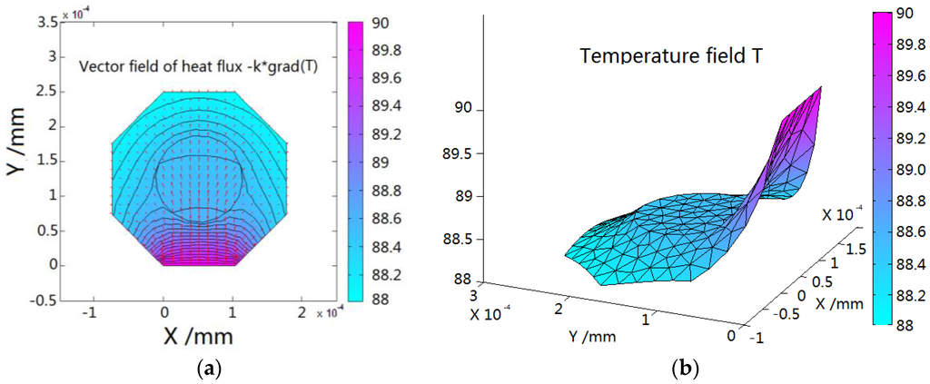 (a) Heat flux and (b) temperature field on optical fiber cross-section.