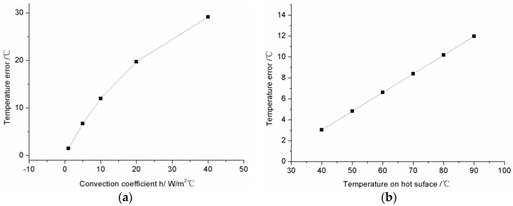 Under the same convection conditions, the measurement error is still affected by the temperature of hot surface measured. The temperature of the hot surface measured, = 40, 50, 60, 70, 80, 90 °C, is changed to study the dependent relationship between the measurement error of the FBG sensor and the real temperature of hot surface. In order to simulate the open system in the laboratory, a convection coefficient equal to 10 W/(m2·°C) is employed. Other parameters are listed in Table 1. The simulation results are shown in Figure 4b. As the measured temperature increases, the temperature error increases linearly. When 90 °C surface temperature is measured by the FBG sensor, the error induced by thermal transfer is 11.9 °C.