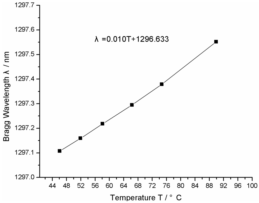 A FBG temperature sensor (its center wavelength is 1297 nm) is dipped into the hot water in the temperature standard setup. The temperature of hot water is changed six times from 46–92 °C and measured by the standard mercury-in-glass thermometers (Grade II). The reflected wavelength of the FBG is recorded by the FBG interrogator (MOI MS130). The calibrated curve is shown in Figure 7. The relationship between the temperature T and center wavelength λ of the FBG temperature sensor can be fitted as follows: