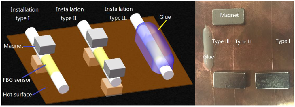 General speaking, there are three installation types are employed in practice measurement. They are single-ended fixation, double-ended fixation, and full fixation. Three calibrated FBG temperature sensors are installed on the surface of the red copper sheet of the temperature standard setup with three different installation types. In Figure 8, the installation type I is the single-ended fixed model. The red copper sheet is the surface-typed temperature standard which simulates the surface of measured object. The FBG sensor is fixed on the red copper sheet by two magnets. One magnet is on the upper surface of the copper sheet and presses the fiber. Another magnet is under the copper sheet and can be pulled by the upper one. Since the FBG is only fixed at one end, it can freely stretch and cling to the red copper sheet. In installation type II, the FBG sensor is fixed on the red copper sheet by four magnets at two ends of the FBG. Installation type III is the adhesive bonding model. The FBG is pasted on the red copper surface by the acrylate adhesive and is fixed fully.