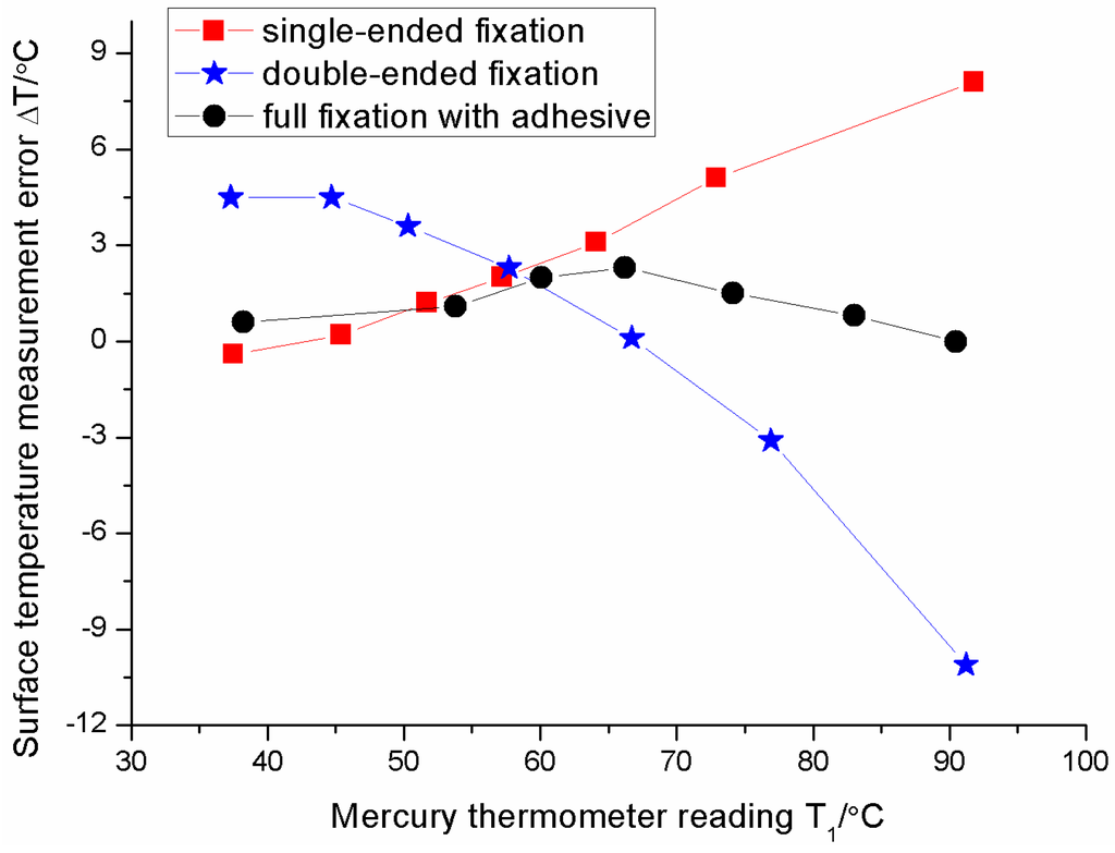 Surface temperature measurement errors of sensor with the full fixation.