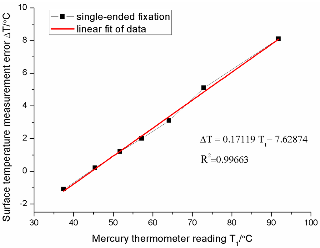 For the single-ended fixation, Figure 10 shows the measurement error increases as the surface temperature increases. The relationship between errors and surface temperatures is approximately linearly dependent. The error is about 8 °C (percentage error is about 8/92 = 8.7%) when the surface temperature is 92 °C. The relationship between the error ΔT and the surface temperature T1 can be fitted as follows: