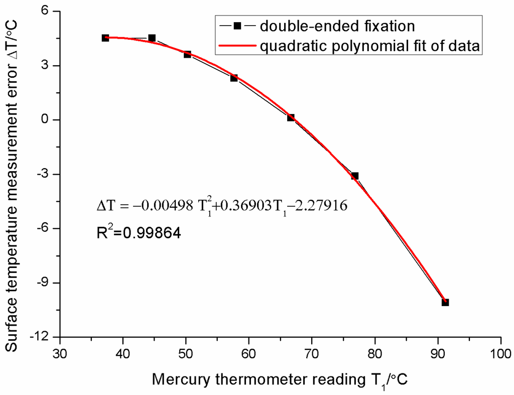 For the double-ended fixation, the measurement errors of the sensor change slowly, and then decrease rapidly as the surface temperature increases in Figure 11. The relationship between errors and surface temperatures is non-linearly dependent. The error at about 65 °C is zero. When the surface temperature exceeds 66 °C, the error ΔT becomes negative. This indicates that the readings of the FBG temperature sensor are higher than those of the surface. The largest error is about −11.1 °C (percentage error is about −12.2%) when the surface temperature is 91 °C. The relationship between the error ΔT and surface temperature T1 can be fitted as follows:
