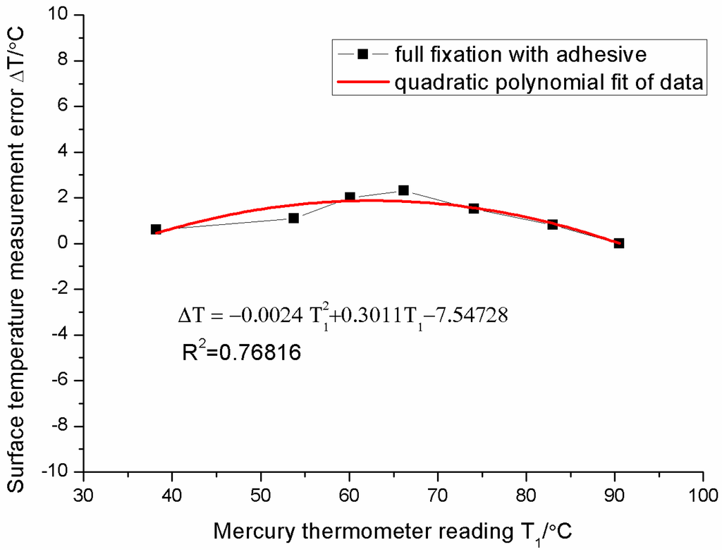 For the fully-adhered fixation, the measurement error of the sensor increases, and then decreases as the surface temperature increases in Figure 12. The fluctuation of the measurement error is no more than 2 °C (percentage error is about 3%) in the temperature range of 35~95 °C. The relationship between the error ΔT and the surface temperature T1 can be fitted as follows: