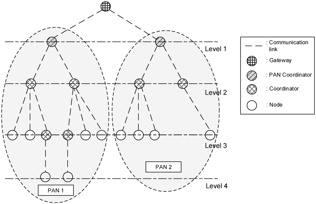 In Figure 1, all devices in the wireless sensor network can connect to the Internet through a gateway. Also, PANs 1 and 2 can extend to the cluster tree topology. Namely, there can exist multiple PANs in the same wireless channel environment. The PAN coordinator connected to the gateway manages its WPAN and can be connected to multiple devices and coordinators. Also, all coordinators can be connected to multiple devices and other coordinators.