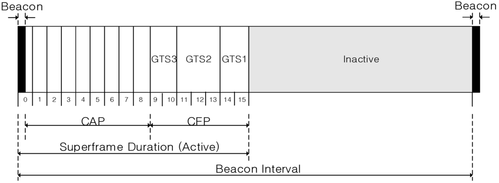 In Figure 2, the superframe of the IEEE 802.15.4 standard is divided into three parts, a beacon period, a superframe duration (SD), and an inactive period. In the beacon period, the PAN coordinator broadcasts its beacon frame, and all devices in the WPAN communicate with each other in the SD. Also, in the inactive period, all devices in WPAN enter into a sleep mode or a standby mode to reduce an energy consumption. The beacon period is located at the beginning of the superframe, and a beacon interval (BI) is equal to the length of one superframe.