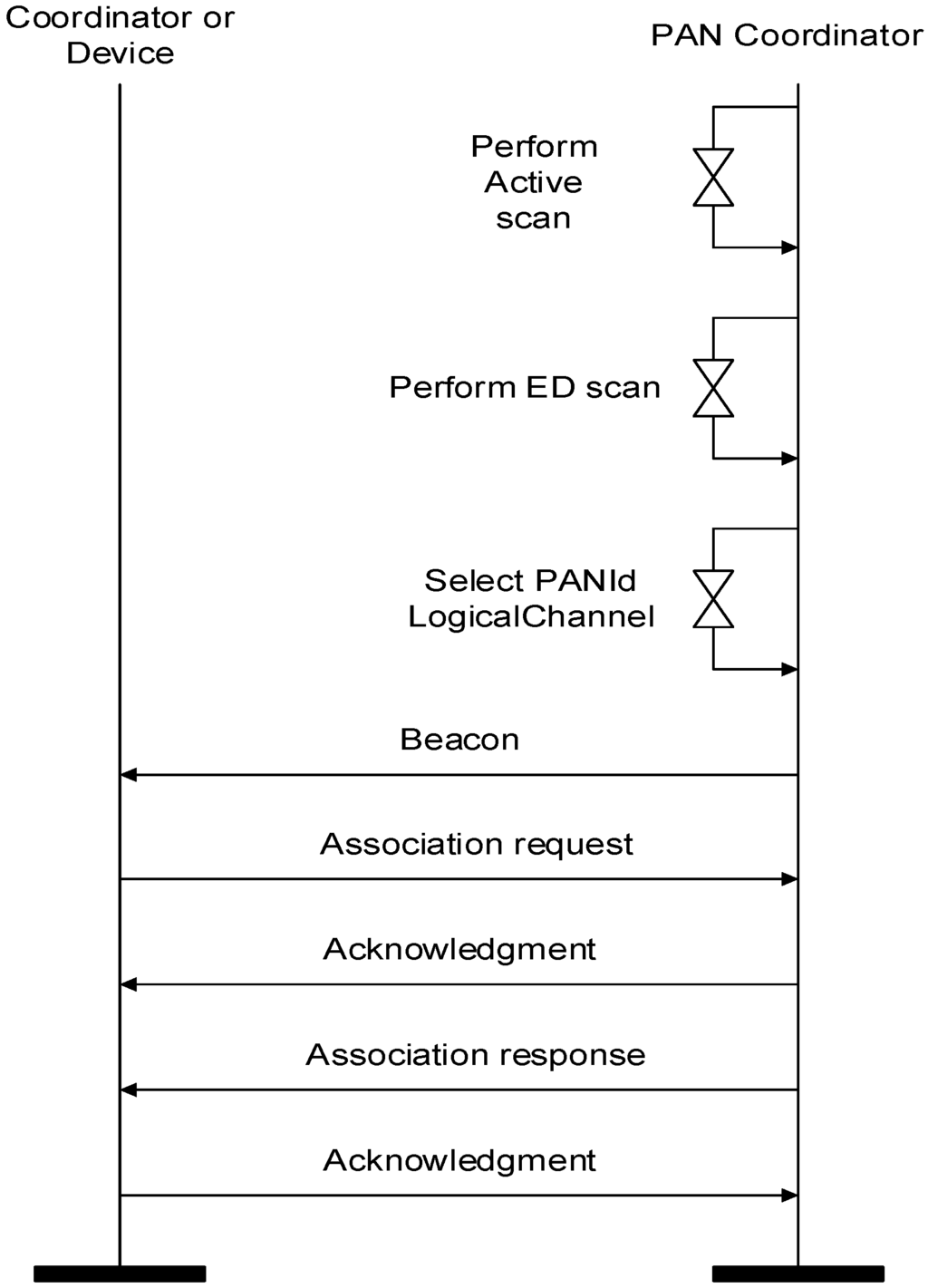 At the initial phase, a PAN coordinator performs an active scan to select a PAN identifier before starting a new PAN, as depicted in Figure 4. Then, the PAN coordinator performs an ED scan to select a clear channel. The PAN coordinator can detect the interference of other networks through the ED scan and save the set of available channels that are not affected by other wireless devices. Then, the PAN coordinator selects a PAN ID and logical channel. The PAN coordinator starts its PAN and commences transmitting periodic beacon frames. A coordinator or devices that receive the beacon frame from the PAN coordinator transmit an association request frame. When the PAN coordinator receives the association request frame, it transmits the association response frame to coordinators or devices. When the devices or the coordinators receive the association response frame from the PAN coordinator, the initial PAN construction process is complete.
