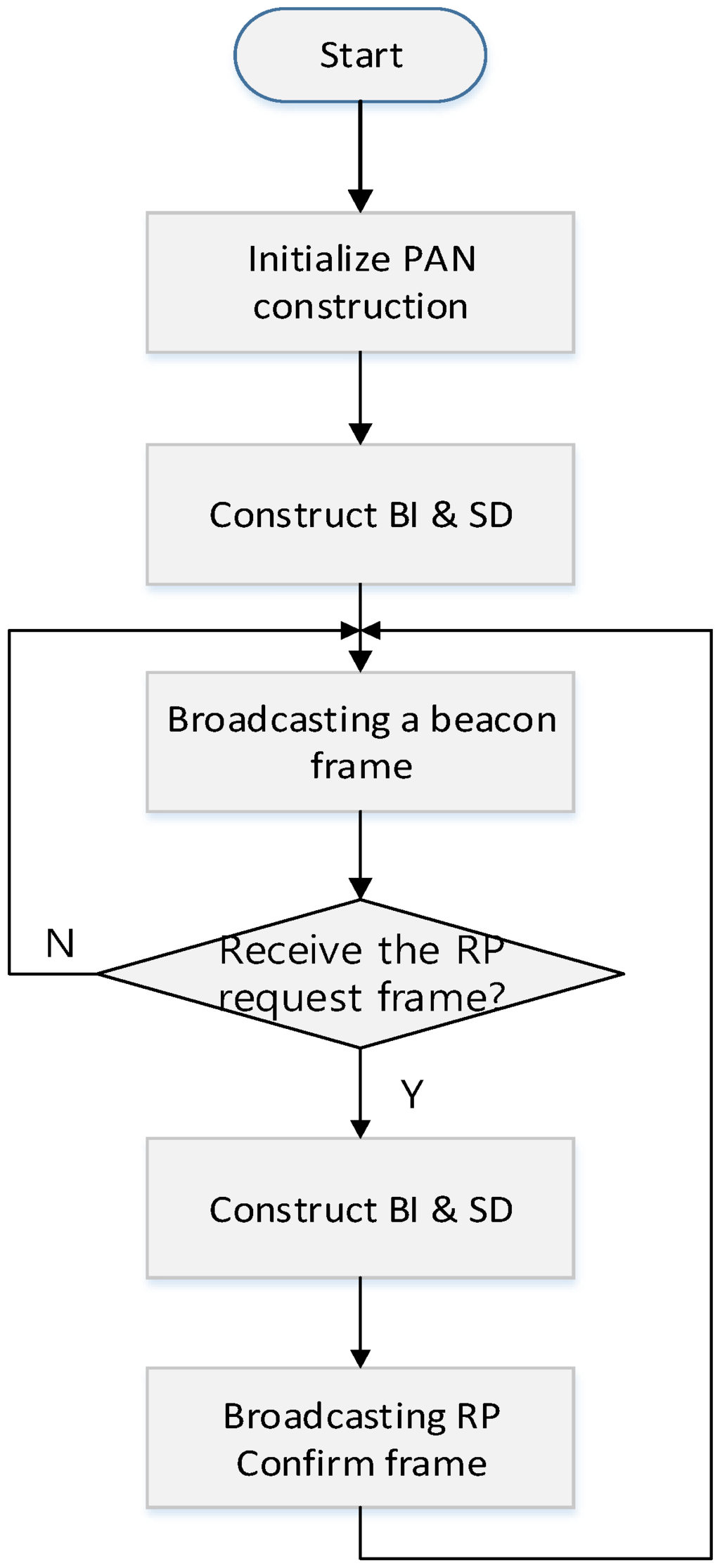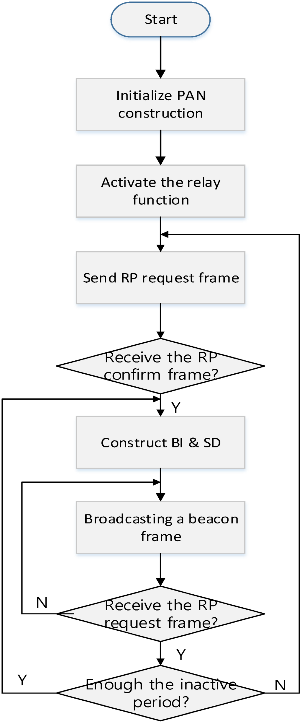 As shown in Figure 8, when a coordinator powers on, it performs the ED scan and joins the existing WPAN. And then, it activates the relay function and transmits the RP request command frame to the PAN coordinator or the higher level coordinator. When it receives the RP response command frame, it constructs its superframe. After that, the coordinator broadcasts a beacon frame including the information of the BI and SD and monitors whether other coordinators transmit the RP request command frame. If it receives the RP request frame, it relays the received RP request frame to the PAN coordinator or the higher level coordinator. In the proposed scheme, the BI of every coordinator in the WPAN is equal to the BI of the PAN coordinator. However, the SD of the coordinator can be adjusted by the number of devices and the lower level coordinators. If the inactive period is insufficient to allocate the SD to the lower level coordinator, the PAN coordinator can adjust its own BI. In the proposed scheme, because all coordinators transmit the beacon frame to their children coordinators in the RP, and the RP is allocated in the CFP, all device can receive the beacon frames from their parent coordinators without the contention. Therefore, the beacon frame transmitted by the PAN coordinator can deliver to all devices in the network without any collision. Also, in the proposed scheme, all devices only synchronize with their parent coordinator and are not affected by other coordinators. Thus, all coordinators can perform the distributed beacon scheduling and can communicate with their children devices in the next SD of their parent coordinator. If the PAN coordinator needs the additional resource and adjusts the BI, every coordinator adjusts their own superframes. Otherwise, the coordinator does not allocate the SD to the lower level coordinator. Figure 9 shows the relay function activation process of the coordinator.