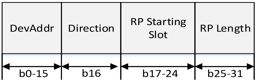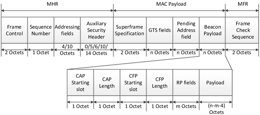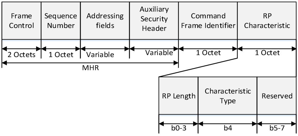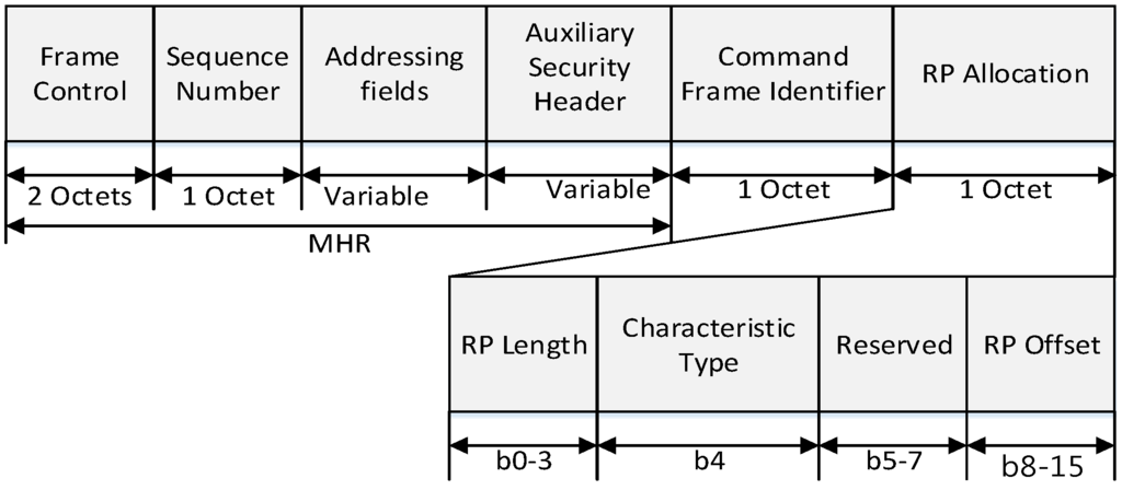 In Figure 11, the CAP offset is composed of a CAP starting slot field and a CAP length field. The CAP starting slot field indicates the time slot number at the beginning of the CAP, and the CAP length field indicates the number of time slots belonging to the CAP. In the same way, the CFP offset is composed of a CFP starting slot field and a CFP length field. The CFP starting slot field indicates the time slot number at the beginning of the CFP, and the CFP length field indicates the number of time slots belonging to the CFP. The sum of the CAP offset and the CFP offset cannot exceed the value of BI. In the proposed scheme, the PAN coordinator and coordinators can adjust the length of the CAP and the CFP. The RP field contains the information of the RP. Figure 12 illustrates the format of the RP fields.