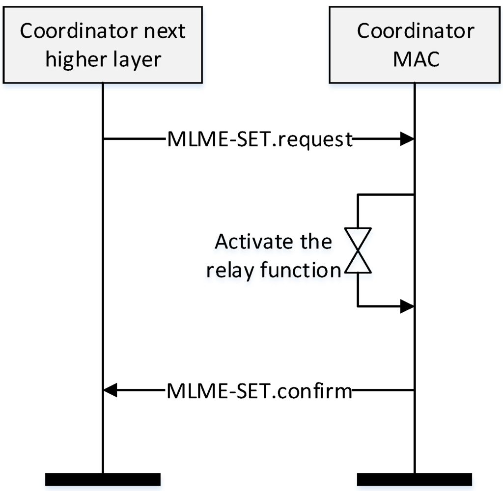As shown in Figure 19, when the coordinator powers on, the MAC layer of the coordinator receives MLME-SET.request message set the RelayFunction parameter to ‘TRUE’ from its higher layer. The MAC layer, after receiving the MLME-SET.request message, activates relay function and constructs a relay table.