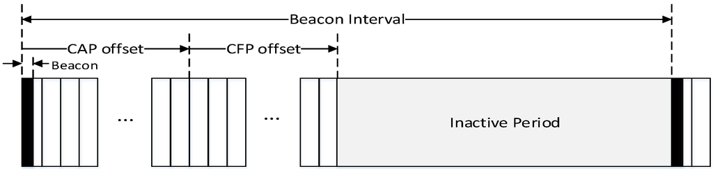 In Figure 10, the PAN coordinator periodically broadcasts the beacon frame in the beacon period. The superframe is composed of numerous time slots with the fixed length, and the time slot is the basic unit of a CAP offset and a CFP offset. In the proposed scheme, because the beacon frame includes the information of the CAP offset and the CFP offset, devices which receive the beacon frame can recognize the length of the CAP and the CFP. Figure 11 shows the format of the proposed beacon frame.