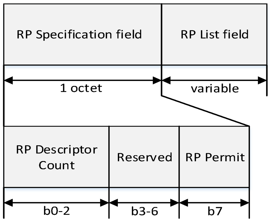 In Figure 12, the RP descriptor count field specifies the number of RP descriptors contained in the RP List field of the beacon frame. If the value of this field is equal to zero, the RP List field of the beacon frame is not present. The RP Permit field is set to one if the coordinator is accepting RP request. Otherwise, the RP permit field shall be set to zero. The size of the RP List field is defined by the values specified in the RP specification field of the beacon frame and contains the list of RP descriptors that represents the RP that is being maintained.