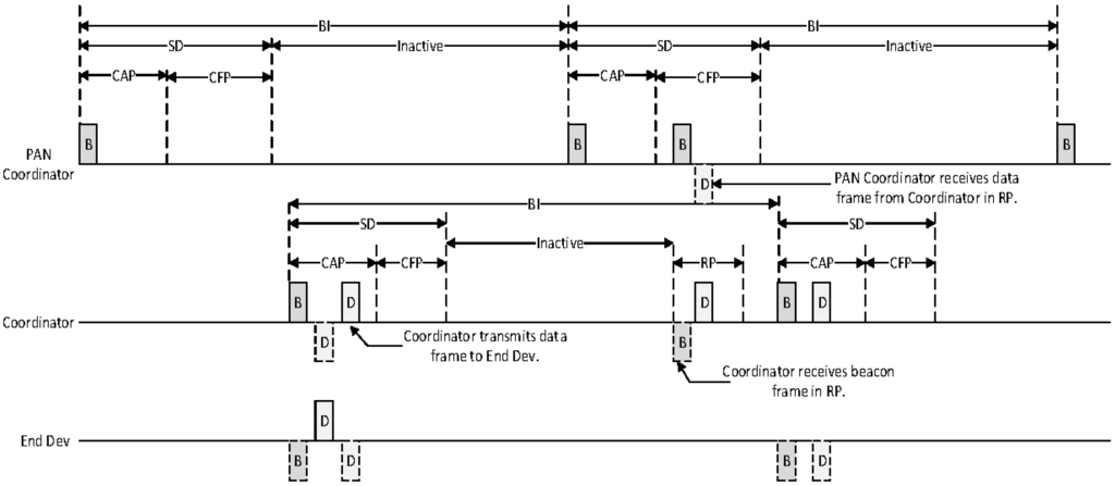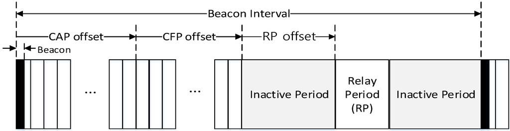 In the proposed scheme, the coordinator can connect to the high-level coordinator or the PAN coordinator. Also, it can connect to the low-level coordinator. In Figure 14, the superframe managed by the coordinator consists of the beacon period, the CAP, the CFP, the inactive period, and the RP. The coordinator uses the beacon period, the CAP, and the CFP to communicate with the low-level coordinator and devices belonging to its own WPAN. Whereas it uses the RP to communicate with the high-level coordinator or the PAN coordinator. Namely, the RP is allocated to relay data frames between the high-level coordinator and the low-level coordinator by the high-level coordinator. In the proposed scheme, the sum of the CAP offset, the CFP offset, the RP offset, and the RP lengths cannot exceed the BI length. Figure 15 shows an example of the superframe operation between the high-level coordinator and the low-level coordinator in the proposed scheme.
