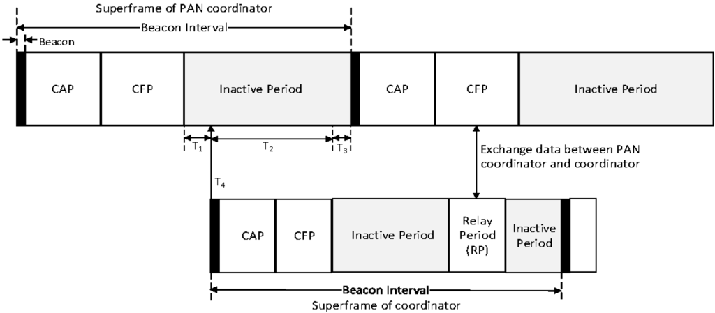 The timing diagram for the proposed relay scheme from an end device to a PAN coordinator.