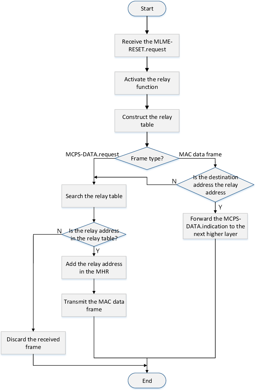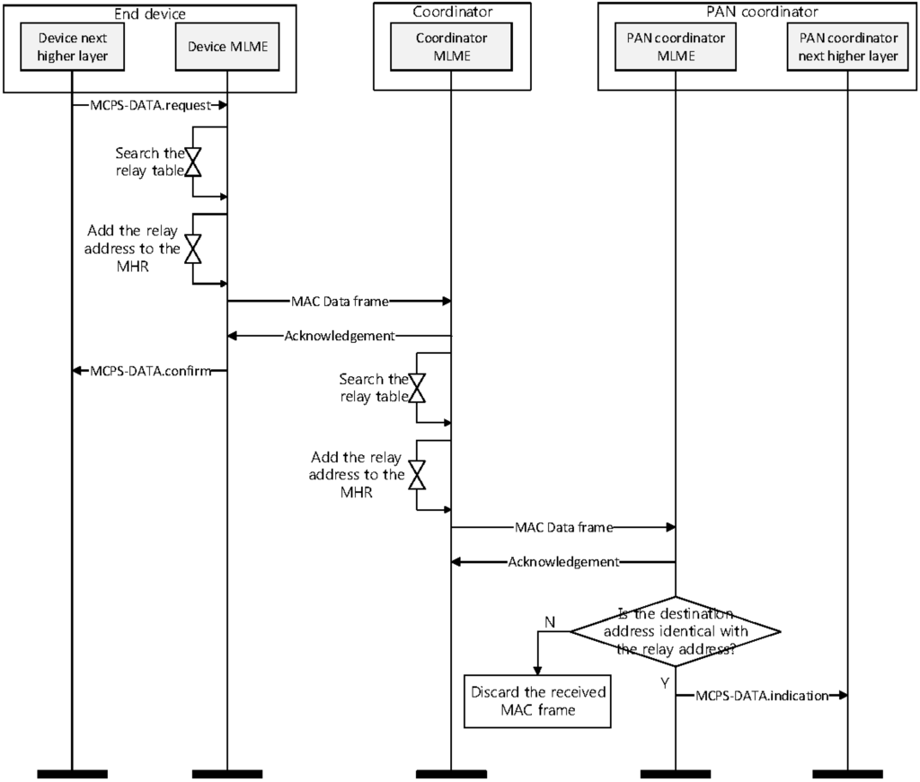 If the coordinator receives a frame from other devices, the MAC layer ascertains if the relay address field and the destination address field in the received data frame indicates its address. If the values of the relay address field and the destination address field are equal to its address, it constructs the MCPS-DATA.indication message and transmits it to its higher layer.