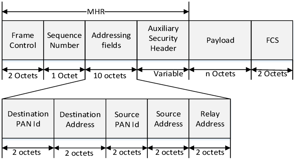 In Figure 6, the MAC header (MHR) field contains the frame control field, the sequence number field, the addressing field, and the auxiliary security header field. The destination addressing mode field in frame control field is set to indicate the short addressing of destination device, and the source addressing mode field in frame control field is set to indicate the short addressing of source device. The frame pending field in frame control field is set to zero and ignored upon reception, and the acknowledgment request (AR) field in the frame control field is set to one. The source PAN identifier field in the addressing field contains the value of macPANId, and the source address field in addressing field contains the value of the short address of source device. The destination address field in addressing field contains the values of the short address of destination device.