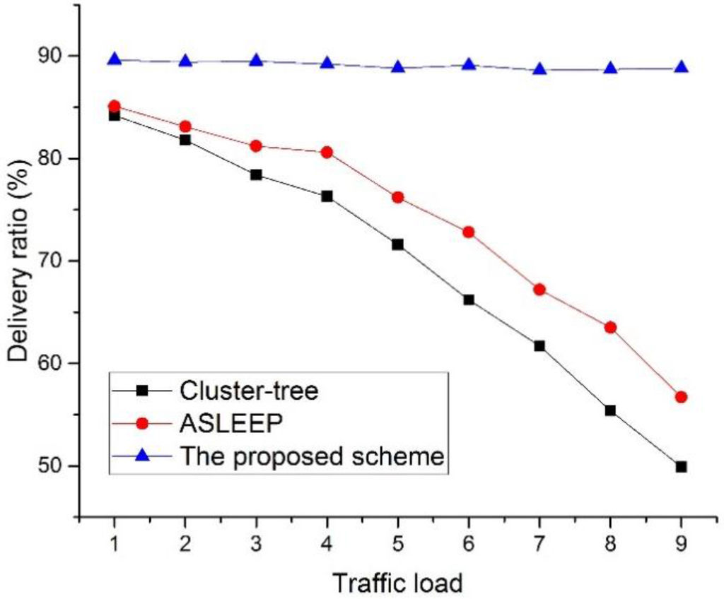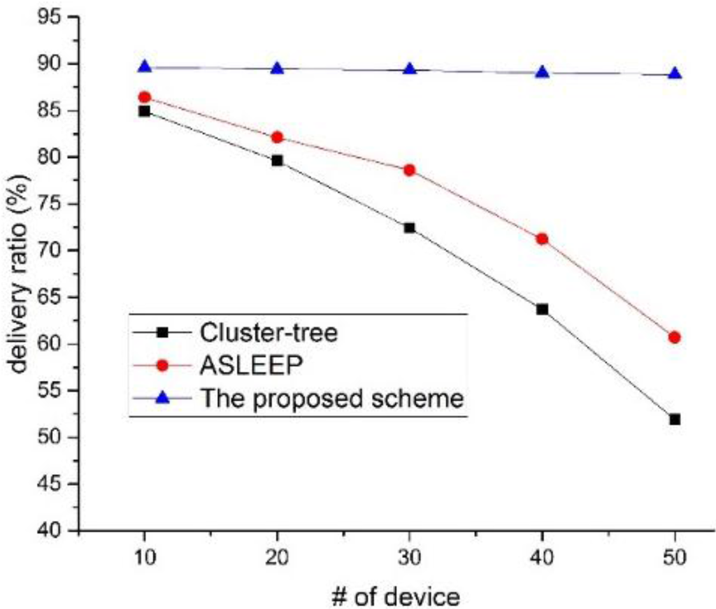 In this simulation, we define the traffic load to the number of data frames transmitted by devices during the BI. In this simulation, all leaf nodes transmit data frames to the PAN coordinator, and the PAN coordinator transmits data frames to the selected leaf node. Also, we fixed the number of devices in the network to 30. As shown in Figure 20, the delivery ratio of the cluster-tree protocol and the ASLEEP protocol decrease as the traffic load on the network increases. This result is related to the fact that the contention for the channel access and the collision probability increases as the traffic load on the network increases. In Figure 20, because the ASLEEP protocol can slightly adjust the superframe duration within the limited bounds, it can provide the transmission probability higher than the cluster-tree protocol. Therefore, the ASLEEP protocol provides the performance of the delivery ratio higher than the cluster-tree protocol. However, as the traffic load increases, the superframe duration of the ASLEEP protocol reaches the envelope and cannot avoid the increased competition. Thus, the performance of the ASLEEP protocol declines largely. Meanwhile, in the proposed scheme, a coordinator does not contend with other leaf nodes for the channel access since it relays data frames to the next hop coordinator in the CFP. Therefore, the proposed scheme shows the similar delivery ratio regardless of an increase of the traffic load, and we can show that the delivery ratio of the proposed scheme is higher than two legacy protocols. Figure 21 shows the delivery ratio as a function of the number of devices in the network.