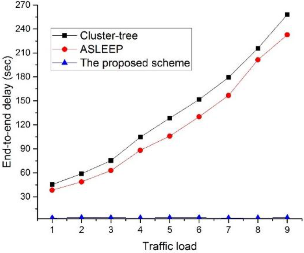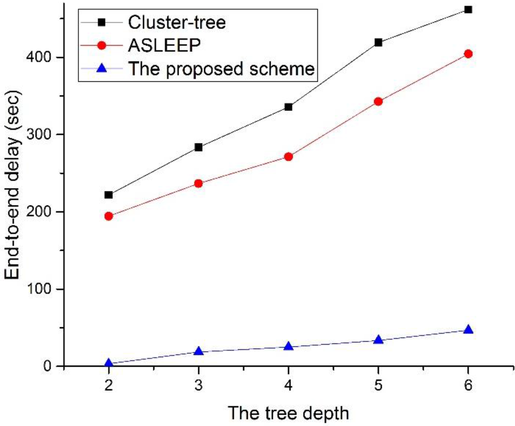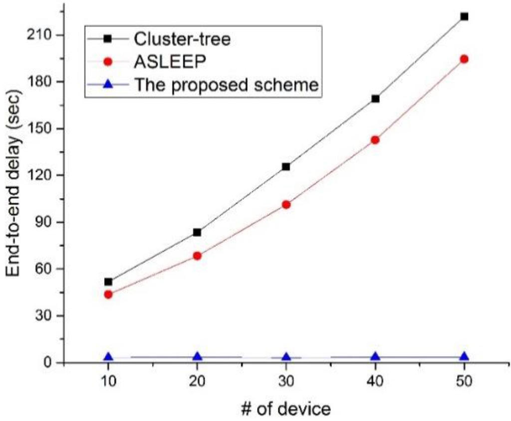 In this simulation, the number of devices in the network is fixed to 30. As illustrated in Figure 22, when the traffic load on the network increases, the end-to-end delay of two legacy protocols also increases. This result is related to the fact that messages are queued at each parent node for the duration of the active period before they can be forwarded up to the tree. In other words, in two legacy protocols, when the traffic load on the network increases, the contention among devices is intense for the channel access, and the possibility to relay data frame in the same superframe is lower. However, the ASLEEP protocol can slightly regulate the superframe duration, and it can reduce the end-to-end delay somewhat. Meanwhile, in the proposed scheme, because the coordinators can relay data frames to the next hop devices in CFP, it can provide the constant end-to-end delay regardless of the traffic load. Therefore, the end-to-end delay of the proposed scheme is superior to two legacy protocols.